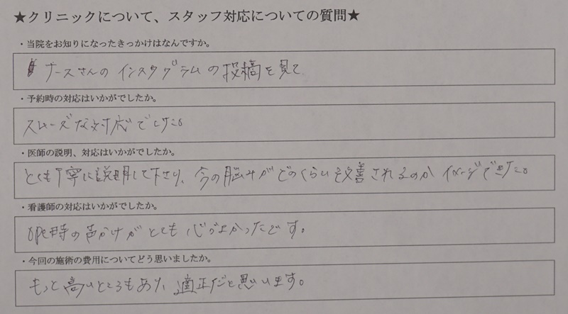 費用 •切らない目の下のたるみ取り(通常料金)270,000円(モニター料金)200,000円 •目の下の切らないたるみ取り+脂肪注入(通常料金)420,000円(モニター料金)340,000円 •ハムラ法(通常料金)460,000円(モニター料金)380,000円 •裏ハムラ法(通常料金)420,000円(モニター料金)340,000円 *別途 静脈麻酔 30,000円(税込)