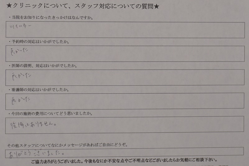 費用 •切らない目の下のたるみ取り(通常料金)270,000円(モニター料金)200,000円 •目の下の切らないたるみ取り+脂肪注入(通常料金)420,000円(モニター料金)340,000円 •ハムラ法(通常料金)460,000円(モニター料金)380,000円 •裏ハムラ法(通常料金)420,000円(モニター料金)340,000円 *別途 静脈麻酔 30,000円(税込)
