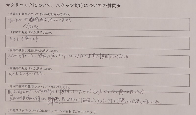 費用 •切らない目の下のたるみ取り(通常料金)270,000円(モニター料金)200,000円 •目の下の切らないたるみ取り+脂肪注入(通常料金)420,000円(モニター料金)340,000円 •ハムラ法(通常料金)460,000円(モニター料金)380,000円 •裏ハムラ法(通常料金)420,000円(モニター料金)340,000円 *別途 静脈麻酔 30,000円(税込)