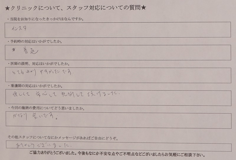 費用 •切らない目の下のたるみ取り(通常料金)270,000円(モニター料金)200,000円 •目の下の切らないたるみ取り+脂肪注入(通常料金)420,000円(モニター料金)340,000円 •ハムラ法(通常料金)460,000円(モニター料金)380,000円 •裏ハムラ法(通常料金)420,000円(モニター料金)340,000円 *別途 静脈麻酔 30,000円(税込)