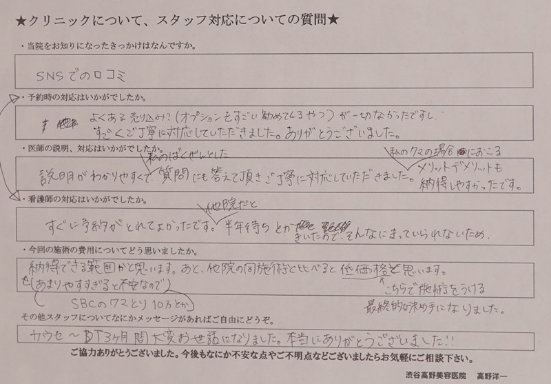 費用 •切らない目の下のたるみ取り(通常料金)270,000円(モニター料金)200,000円 •目の下の切らないたるみ取り+脂肪注入(通常料金)420,000円(モニター料金)340,000円 •ハムラ法(通常料金)460,000円(モニター料金)380,000円 •裏ハムラ法(通常料金)420,000円(モニター料金)340,000円 *別途 静脈麻酔 30,000円(税込)
