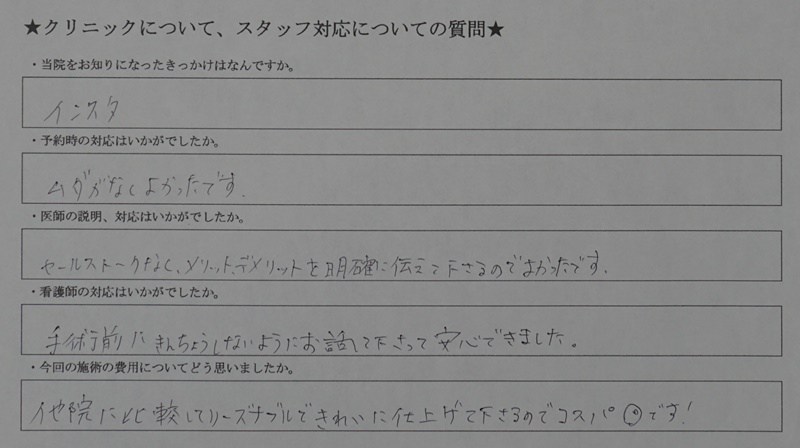 費用 •切らない目の下のたるみ取り(通常料金)270,000円(モニター料金)200,000円 •目の下の切らないたるみ取り+脂肪注入(通常料金)420,000円(モニター料金)340,000円 •ハムラ法(通常料金)460,000円(モニター料金)380,000円 •裏ハムラ法(通常料金)420,000円(モニター料金)340,000円 *別途 静脈麻酔 30,000円(税込)
