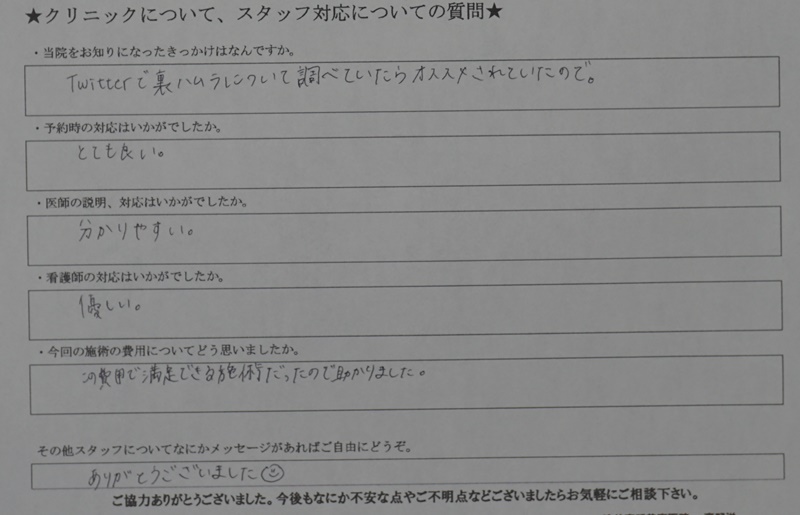 費用 •切らない目の下のたるみ取り(通常料金)270,000円(モニター料金)200,000円 •目の下の切らないたるみ取り+脂肪注入(通常料金)420,000円(モニター料金)340,000円 •ハムラ法(通常料金)460,000円(モニター料金)380,000円 •裏ハムラ法(通常料金)420,000円(モニター料金)340,000円 *別途 静脈麻酔 30,000円(税込)