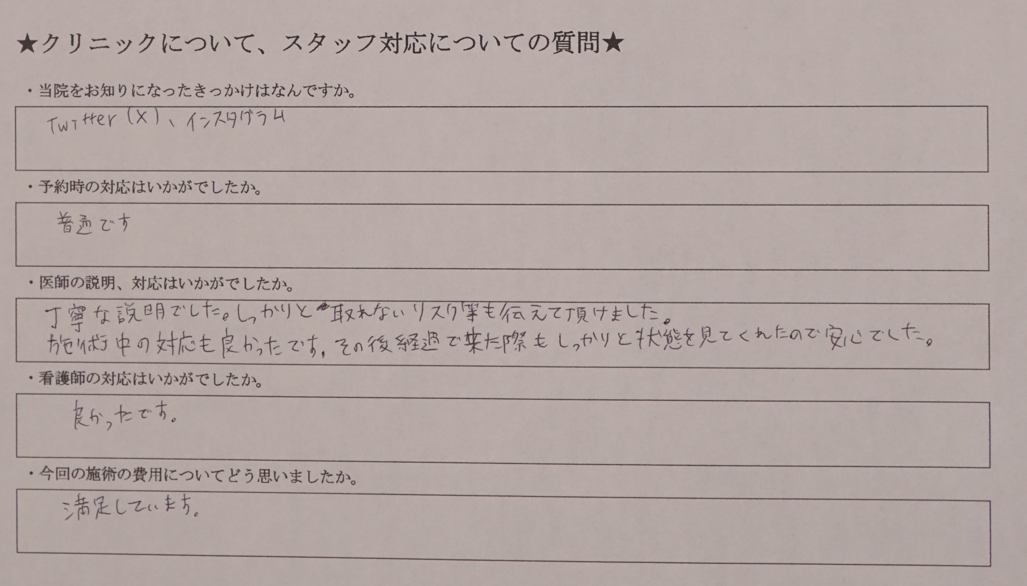 費用 •切らない目の下のたるみ取り(通常料金)270,000円(モニター料金)200,000円 •目の下の切らないたるみ取り+脂肪注入(通常料金)420,000円(モニター料金)340,000円 •ハムラ法(通常料金)460,000円(モニター料金)380,000円 •裏ハムラ法(通常料金)420,000円(モニター料金)340,000円 •目の下の修正(眼窩隔膜前面のもの)(通常料金)480,000円(モニター料金)380,000円 •目の下の修正(筋肉内のもの)(通常料金)660,000円(モニター料金)550,000円 *別途 静脈麻酔 30,000円(税込)