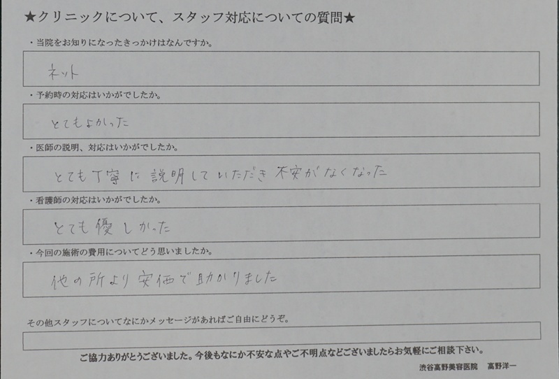 費用 •切らない目の下のたるみ取り(通常料金)270,000円(モニター料金)200,000円 •目の下の切らないたるみ取り+脂肪注入(通常料金)420,000円(モニター料金)340,000円 •ハムラ法(通常料金)460,000円(モニター料金)380,000円 •裏ハムラ法(通常料金)420,000円(モニター料金)340,000円 *別途 静脈麻酔 30,000円(税込)