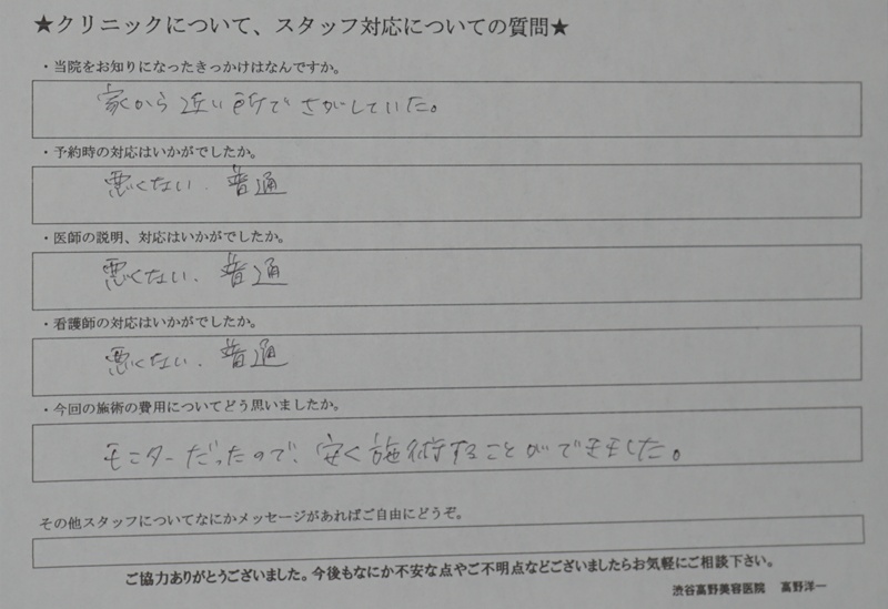 費用 •切らない目の下のたるみ取り(通常料金)270,000円(モニター料金)200,000円 •目の下の切らないたるみ取り+脂肪注入(通常料金)420,000円(モニター料金)340,000円 •ハムラ法(通常料金)460,000円(モニター料金)380,000円 •裏ハムラ法(通常料金)420,000円(モニター料金)340,000円 •目の下の修正(眼窩隔膜前面のもの)(通常料金)480,000円(モニター料金)380,000円 •目の下の修正(筋肉内のもの)(通常料金)660,000円(モニター料金)550,000円 *別途 静脈麻酔 30,000円(税込み)