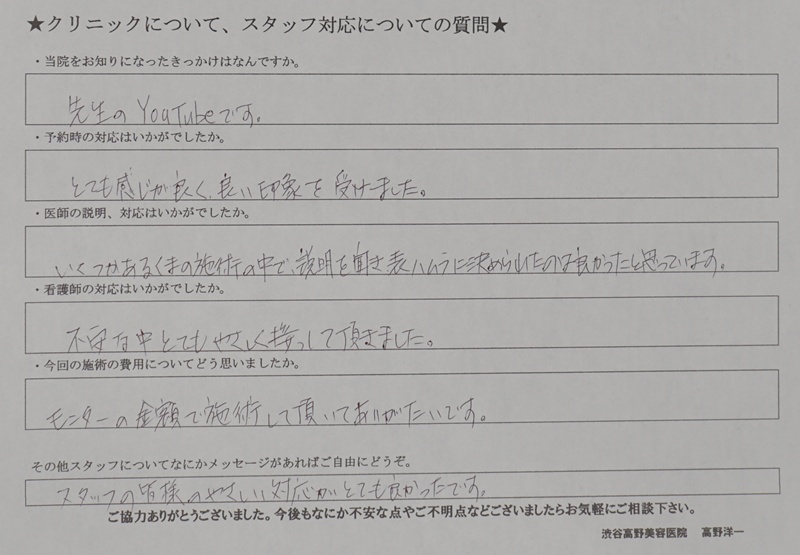 費用 •切らない目の下のたるみ取り(通常料金)270,000円(モニター料金)200,000円 •目の下の切らないたるみ取り+脂肪注入(通常料金)420,000円(モニター料金)340,000円 •ハムラ法(通常料金)460,000円(モニター料金)380,000円 •裏ハムラ法(通常料金)420,000円(モニター料金)340,000円 *別途 静脈麻酔 30,000円(税込)