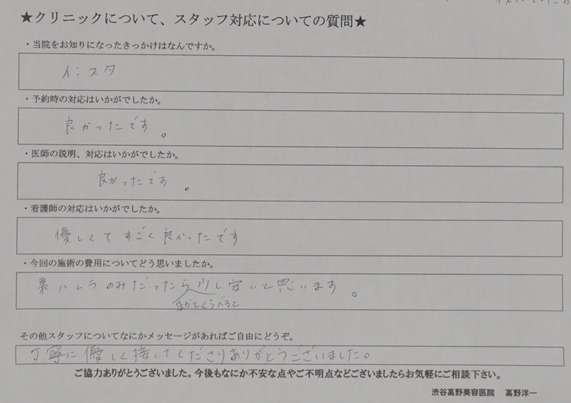 費用 •切らない目の下のたるみ取り(通常料金)270,000円(モニター料金)200,000円 •目の下の切らないたるみ取り+脂肪注入(通常料金)420,000円(モニター料金)340,000円 •ハムラ法(通常料金)460,000円(モニター料金)380,000円 •裏ハムラ法(通常料金)420,000円(モニター料金)340,000円 •目の下の修正(眼窩隔膜前面のもの)(通常料金)480,000円(モニター料金)380,000円 •目の下の修正(筋肉内のもの)(通常料金)660,000円(モニター料金)550,000円 *別途 静脈麻酔 30,000円(税込)