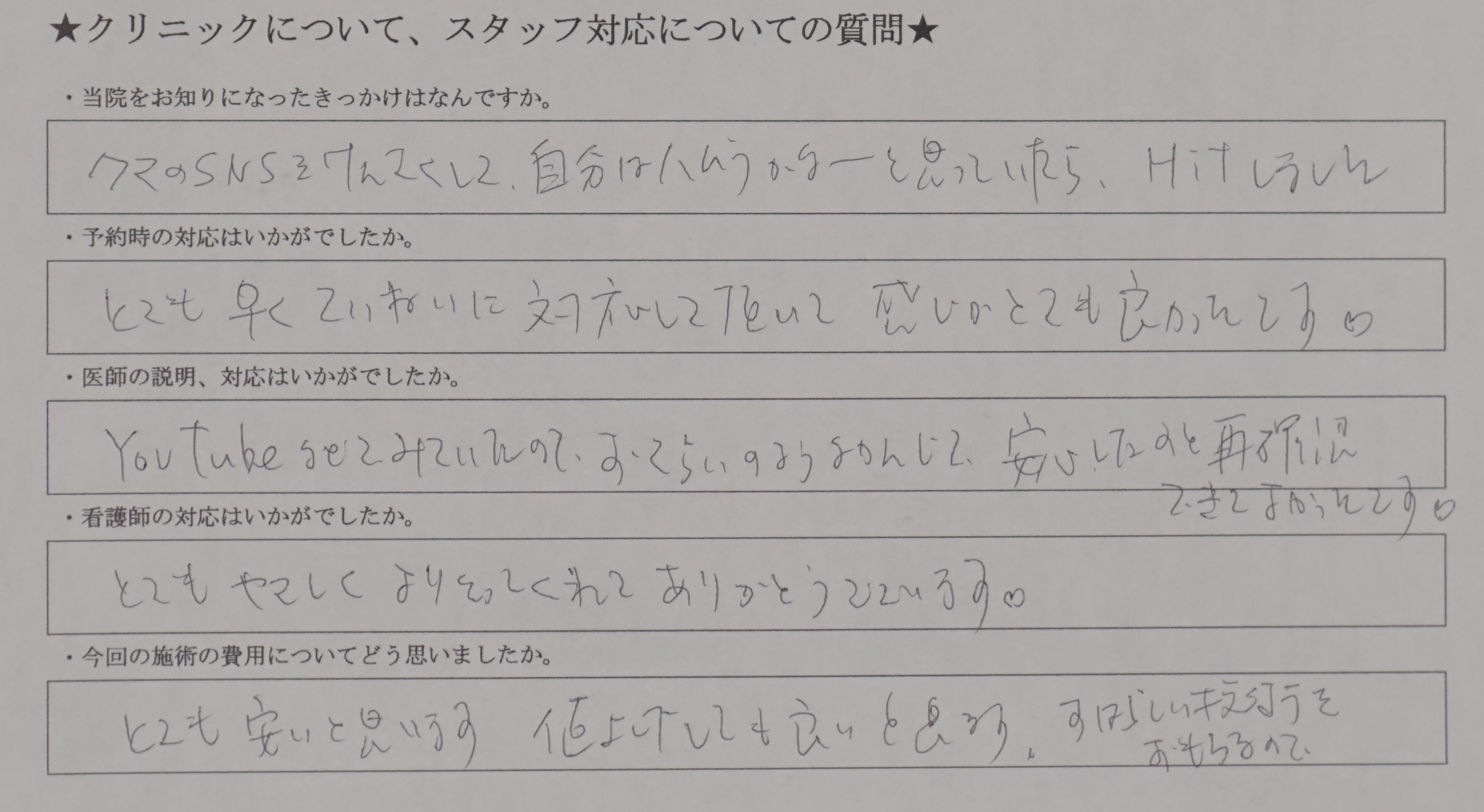 費用 •切らない目の下のたるみ取り(通常料金)270,000円(モニター料金)200,000円 •目の下の切らないたるみ取り+脂肪注入(通常料金)420,000円(モニター料金)340,000円 •ハムラ法(通常料金)460,000円(モニター料金)380,000円 •裏ハムラ法(通常料金)420,000円(モニター料金)340,000円 *別途 静脈麻酔 30,000円(税込)