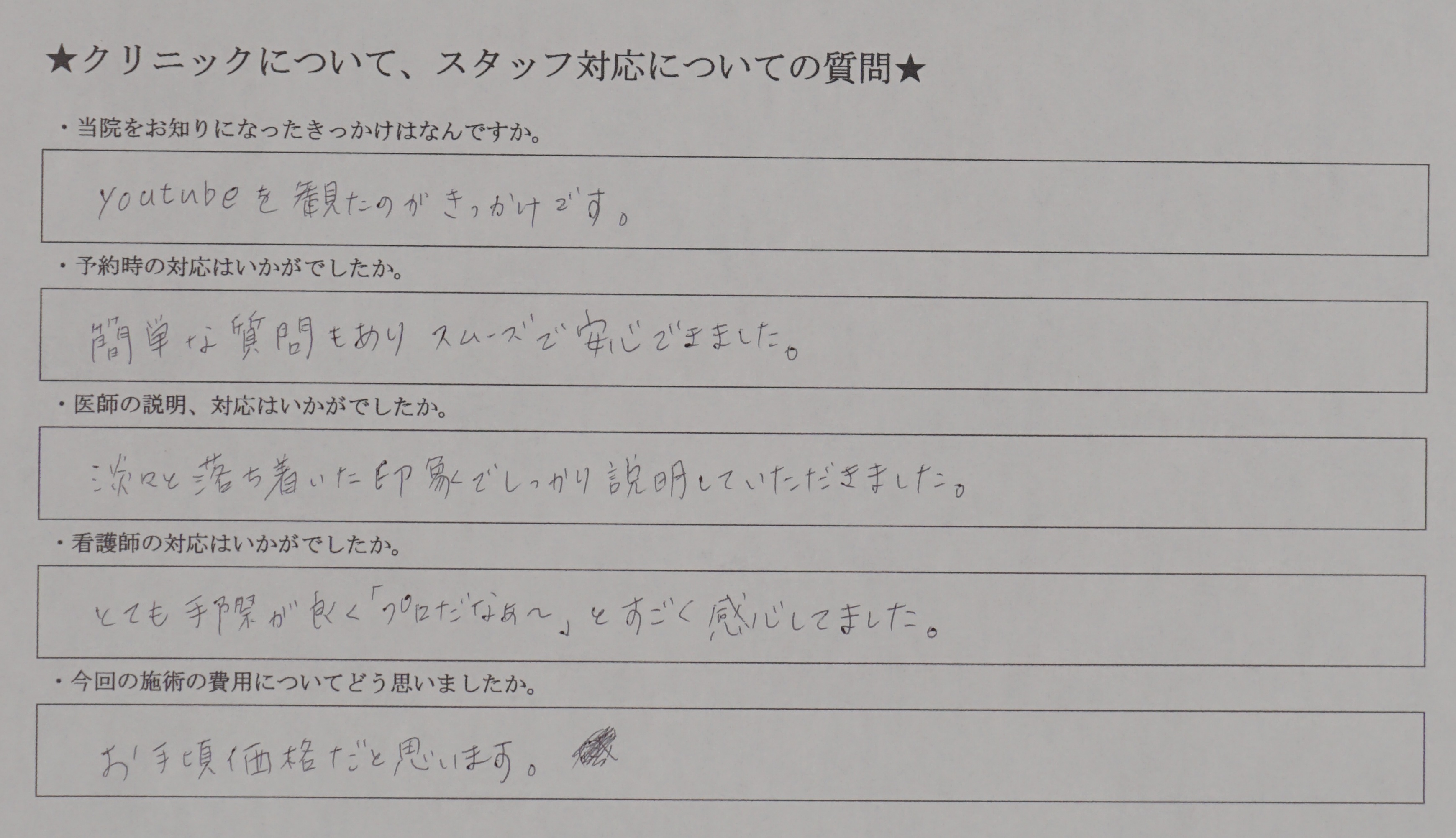 費用 •切らない目の下のたるみ取り(通常料金)270,000円(モニター料金)200,000円 •目の下の切らないたるみ取り+脂肪注入(通常料金)420,000円(モニター料金)340,000円 •ハムラ法(通常料金)460,000円(モニター料金)380,000円 •裏ハムラ法(通常料金)420,000円(モニター料金)340,000円 •目の下の修正(眼窩隔膜前面のもの)(通常料金)480,000円(モニター料金)380,000円 •目の下の修正(筋肉内のもの)(通常料金)660,000円(モニター料金)550,000円 *別途 静脈麻酔 30,000円(税込)